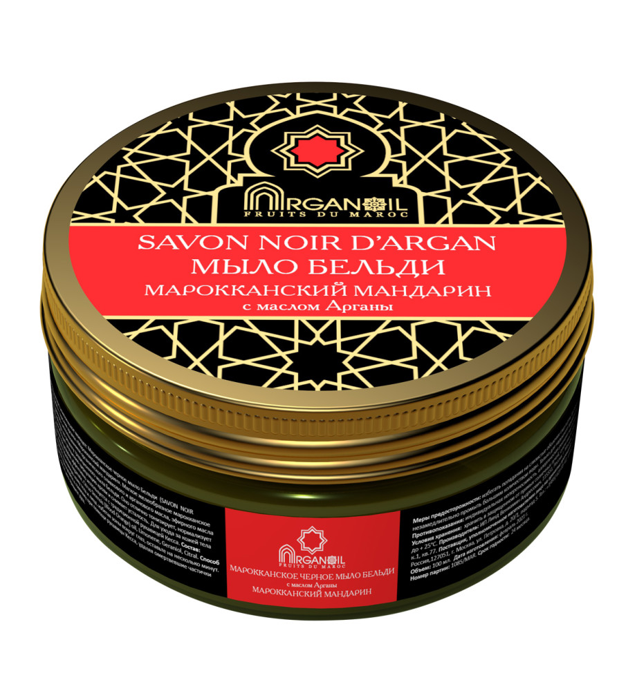 Средство косметическое гигиеническое моющее марки "ARGANOIL" серии "Fruits du Maroc": Марокканское черное мыло Бельди с маслом арганы "Марокканский мандарин"