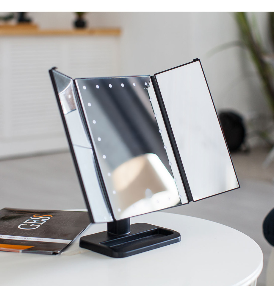 Настоящая мини-студия для макияжа – настольное складное трехстворчатое зеркало с подсветкой. С таким зеркалом вы сможете увидеть себя со всех сторон и создать неповторимый образ за считанные минуты. У зеркала светодиодная подсветка из 24 LED ламп, боковые створки с увеличением в 1, 2 и 3 раза. Удобная подставка легко поворачивается на 180 градусов, позволяя установить необходимый ракурс. В сложенном виде ширина зеркала составляет 19.5 см, в разложенном 38 см. Есть сенсорная кнопка регулирования яркости подсветки на зеркальной панели. Зеркало работает как от USB, так и от батареек.